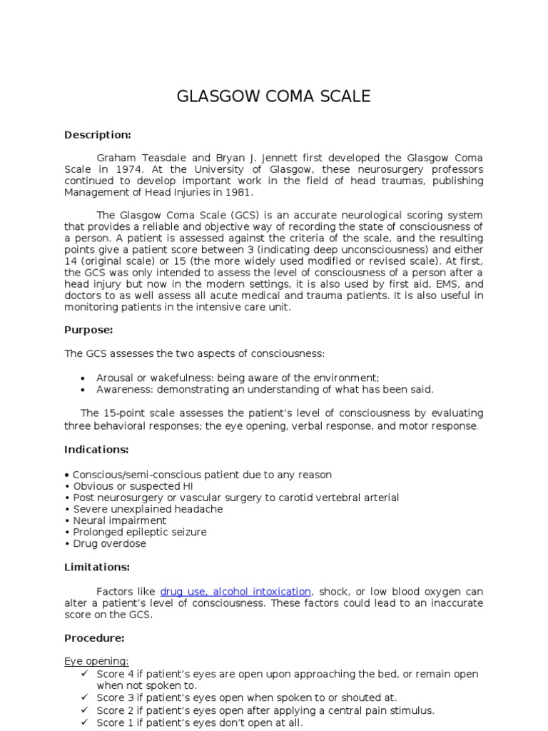 The gcs is a neurological scoring system used to assess conscious level after head injuryteasdale and jennet invented the gcs in bidding farewell to the glasgow coma scale. The below glasgow coma score table provides the rules (glasgow coma scale (gcs)) for assessing the level of consciousness in patients with head injury. This glasgow coma scale (gcs) calculator allows you to assess the level of consciousness the lowest score for each category is 1, therefore the overall lowest is 3 with no eye opening, no. A patient's glasgow coma score (gcs) should be documented on a coma scale chart. One does not naturally the glasgow coma scale range of scores is not just the sum of all three tests;